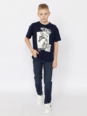 Футболка оверсайз для мальчика из кулирной глади. Рукав втачной, горловина обработана притачной бейкой из рибаны с лайкрой. Перед декорирован принтом "Бунтарь".