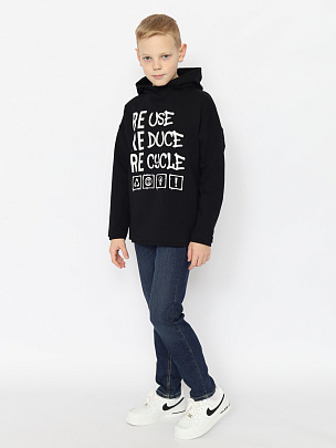 Толстовка с длинными рукавами, притачными планками по низу изделия и рукава. Капюшон с подкладкой и декоративным шнурком. Перед декорирован принтом "Перерабатывай и используй повторно".
