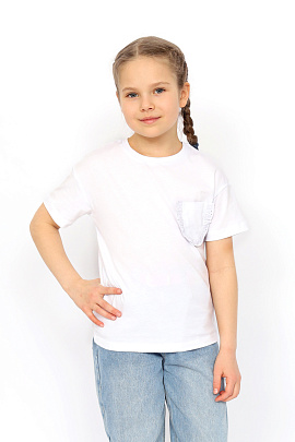 Футболка со спущенным плечом и короткими рукавами. Спереди карман декорирован ришелье. Горловина круглая, обработана притачной бейкой. По ростку горловины шов притачивания закрыт долевиком.