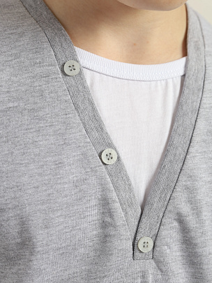 Джемпер с длинным втачным рукавом. Воротник с вырезом и имитацией футболки, по краю ланки воротника расположены декоративные пуговицы.