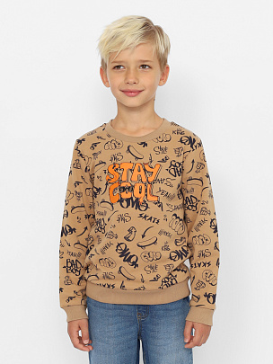 Джемпер для мальчика свободного силуэта с карманом спереди и притачным эластичным поясом по низу. Горловина круглая, обработана притачным воротником из полотна с эластаном. Рукава длинные с эластичными манжетами по низу. Перед джемпера декорирован принтом "Маленькие шаги приводят к большим переменам".