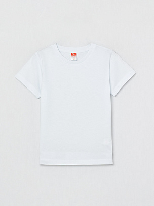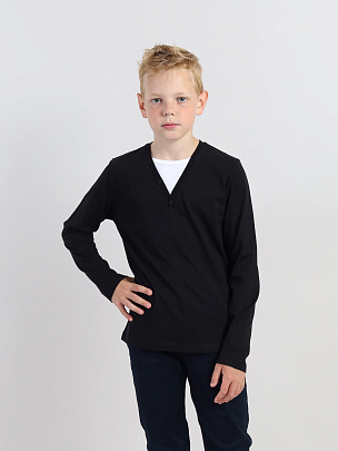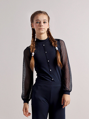 Джемпер для девочки с короткими рукавами, свободного силуэта, спущенным плечом и отложным воротником. Сзади застежка на пуговицу. Спереди декорирован металлическим лейблом.