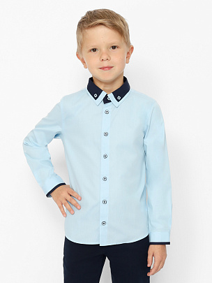 Рубашка классическая, полуприталенного силуэта, с длинным рукавом рубашечного покроя, с притачными манжетами, с застегивающейся шлицей рукава. Воротник двойной, обтачной с притачной стойкой контрастного цвета и декоративными пуговицами. Манжет с отрезной планкой контрастного цвета.