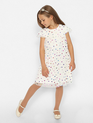 Нарядное платье свободного силуэта, с короткими рукавами. Нижний слой платья из хлопковой кулирки. Верхний слой платья из сетки с блестящими кружочками "конфетти". Сзади застежка на пуговицы.