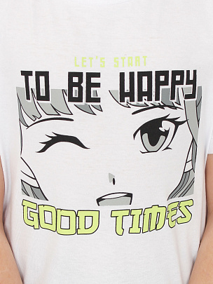 Футболка с коротким рукавом. Горловина круглая, обработана узким воротником из полотна с эластаном. Перед оформлен принтом.