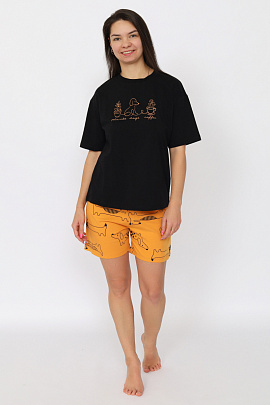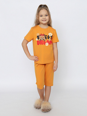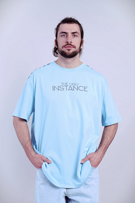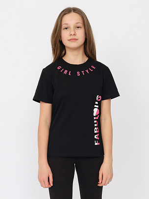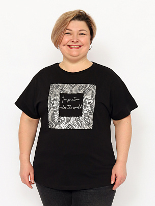 Футболка oversize с короткими рукавами. Горловина круглая, обработана притачной бейкой из рибаны с лайкрой. Перед футболки декорирован принтом с использованием глиттера.