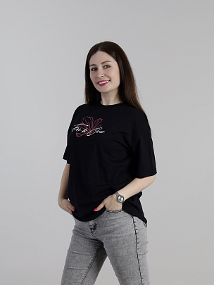 Футболка oversize с короткими рукавами. Горловина круглая, обработана притачной бейкой из рибаны с лайкрой. Перед футболки декорирован принтом с использованием глиттера.